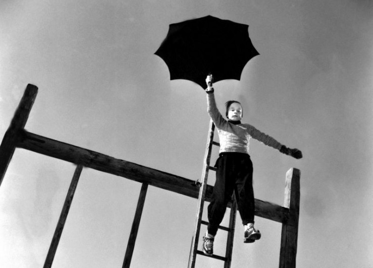 Uli (Knut Mahlke) springt mit einem Schirm vom Klettergerüst, um allen zu beweisen, dass er kein Feigling ist.