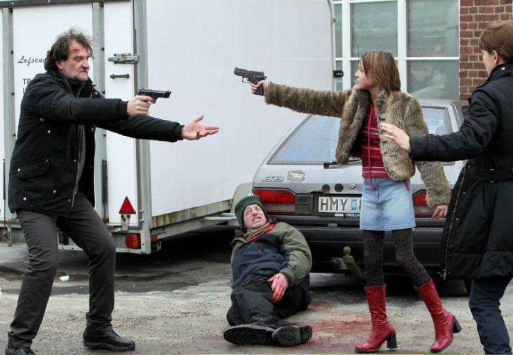 Irene Huss (Angela Kovács) will die Prostituierte Leili (Katja Levander) daran hindern, sich an ihren beiden Peinigern, dem russischen Mädchenhändler Sergeij Petrov (Miodrag Stojanovic, links) und seinem Gehilfen (Kristian Lima de Faria), zu rächen.