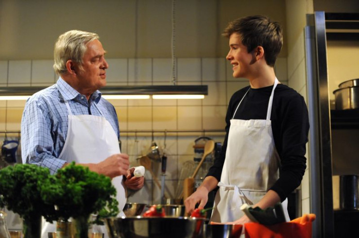 Patrick hat Spaß an seinem Job als Küchenhilfe. Von links: Joseph Brunner (Wilhelm Manske) und Patrick Westenrieder (Lucas Bauer).