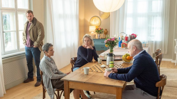 Kommissar Pöhlmann (Dominic Boeer, l.) erfährt von Regine Hagen (Birte Berg, 2.v.l.), Frieda (Gisela Straehle, M.) und Heinrich Witt (Jochen Kolenda, r.), dass die sich gerade erst den Traum einer Alters-WG erfüllt haben. Doch nun ist Mitbewohnerin Ilse Eger ermordet worden. Am Abend zuvor hat die Tote ihren Geburtstag mit zahlreichen Gästen gefeiert. Ist der Mörder unter den Gästen gewesen?