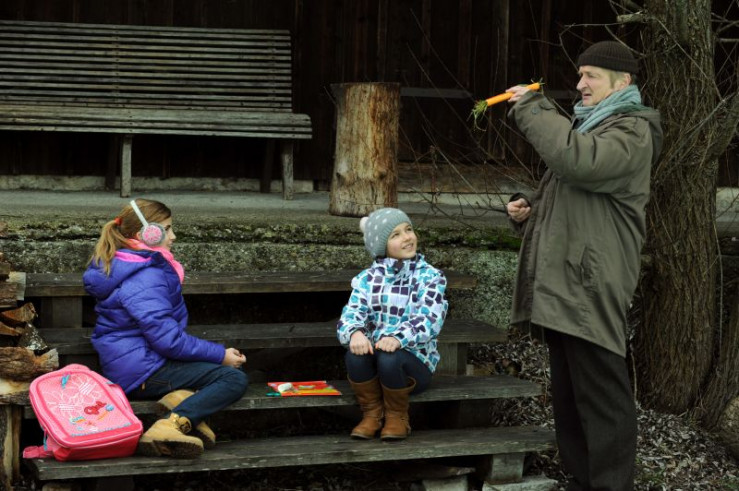 Xaver begegnet auf seinem Spaziergang Valentina und Emily. Von links: Valentina Götz (Lilli Reulein), Freundin Emily (Florentina Kaffl) und Xaver (Michael Schreiner).