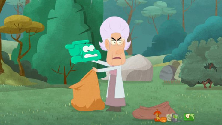 Frau Direktorin Schachschneider (r.) hat alle Spielsachen der Schüler eingesammelt. Als letztes packt sie Ernest (l.) in den Müllsack.