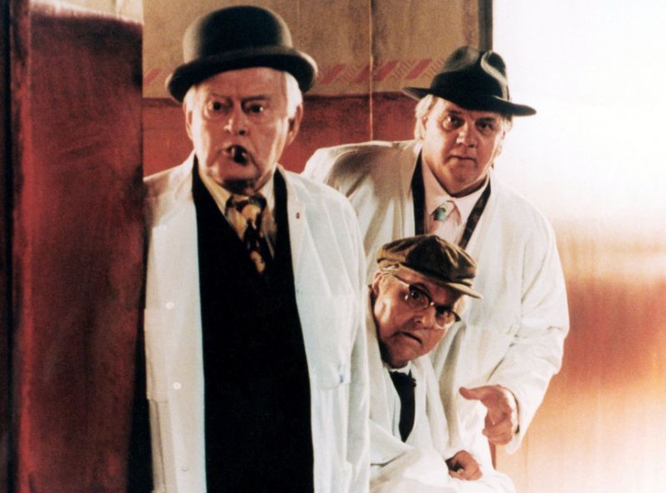 Kjeld (Poul Bundgaard, Mitte) und Benny (Morten Grunwald) versucht er, ins Institut einzubrechen.