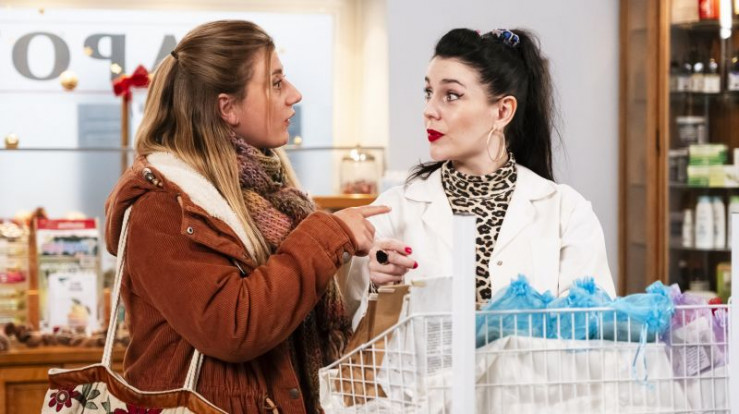 Tina (Anita Eichhorn, rechts) wundert sich gegenüber Sarah (Sophie Reiml, links), dass niemand das Geschenk aus Türchen 24 abgeholt hat, da es sich um ein elektronisches Gerät handelt. Weiteres Bildmaterial finden Sie unter www.br-foto.de.