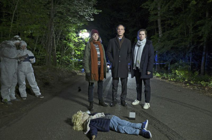 Das Ermittlerteam stellt fest, dass es sich bei dem Opfer auf der Landstraße nicht um eine Kinderleiche, sondern um eine Attrappe handelt; v.l.: Karin Gorniak (Karin Hanczewski), Peter Michael Schnabel (Martin Brambach) und Leo Winkler (Cornelia Gröschel)