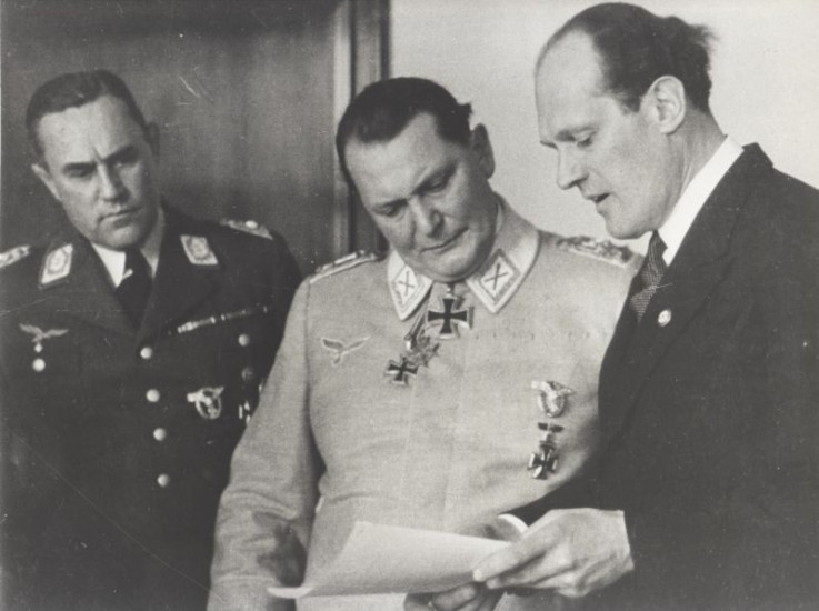 Oberbefehlshaber der deutschen Luftwaffe, Hermann Göring (M.), mit seinem Adjutanten Karl Bodenschatz (l.) und dem Ingenieur Willy Messerschmitt (r.).