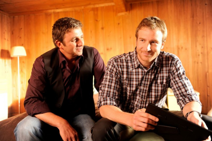 Martin (Hans Sigl, l.) will Hans (Heiko Ruprecht, r.) zum Frühstück holen, da findet er ihn auf der Bettkante sitzend und in Gedanken vor. Kann es sein, dass er sich neu verliebt hat?