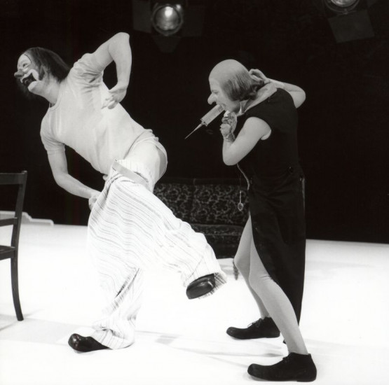 Clownesque Impfszene: Umberto Troni als Patient und Stefano Manca als Arzt.