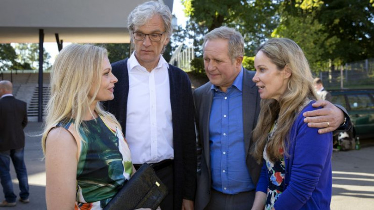 Die Schröders Bernd (Harald Krassnitzer, 2. v. re.) und Sabine (Ann-Kathrin Kramer, re.) treffen sich auf dem Abi-Feier ihrer Kinder und tauschen sich mit den Winters Tanja (Susanne Simon, li.) und Matthias (Walter Sittler, 2. v. li.) darüber aus, was ihre Kinder nach Abitur machen werden.