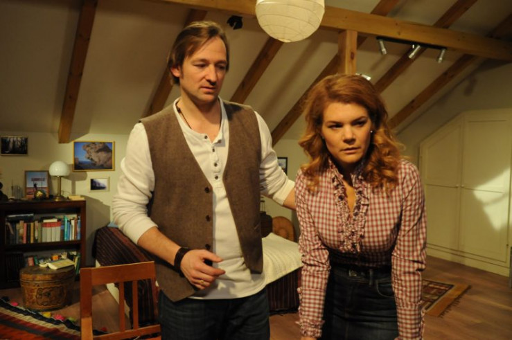 Gregor hilft Uschi, als sie einen Schwächeanfall erleidet. Von links: Gregor Brunner (Holger M. Wilhelm) und Uschi Guggenmoser (Silke Popp).