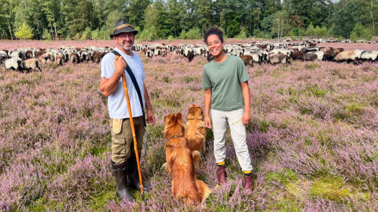 Tierreporterin Pia mit Heidschuckenschäfer Michael. (Michael Seel). Weiteres Bildmaterial finden Sie unter www.br-foto.de.