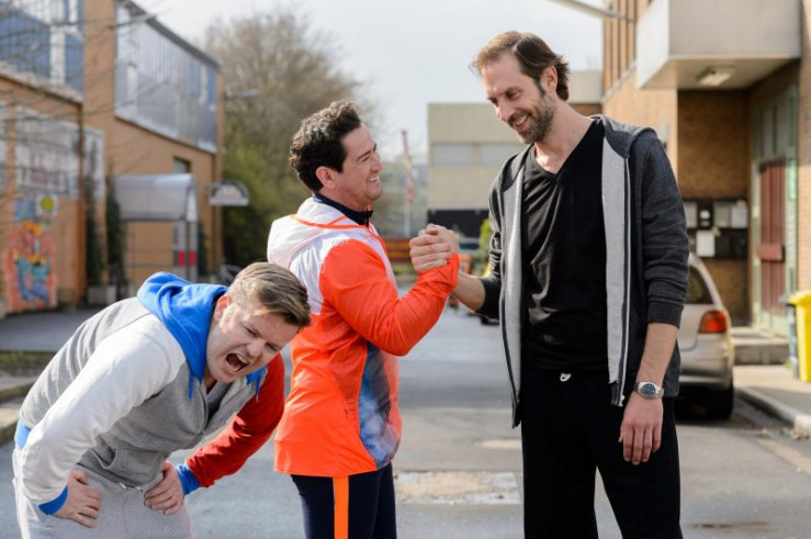 Ingo (André Dietz, l.) kann beim gemeinsamen Training mit Marian (Sam Eisenstein, M.) und Erik (Alexander Wüst) kaum mithalten und wird von den beiden freundschaftlich unterstützt. +++ Die Verwendung des sendungsbezogenen Materials ist nur mit dem Hinweis und Verlinkung auf RTL+ gestattet. +++
