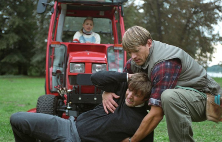 Sofia (Jytte-Merle Böhrnsen, l.) hat den Traktor nicht im Griff und überfährt beinahe Eddie (Christoph Mory, M.). Gärtner Sven (Jorres Risse, r.) hilft.