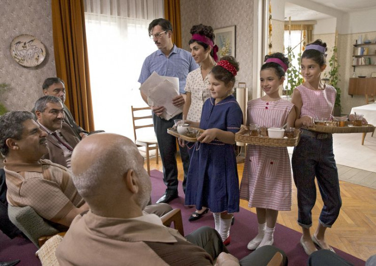 Latife (Neda Rahmanian, stehend 2. v. li.), Ehemann Burhan (Murathan Muslu, stehend li.) und ihre Töchter Lale (Elyna Donchev, stehend r.), Peyda (Anna Shirin Habedank, stehend 2. v. re.) und Nihal (Ronja Russow, stehend 3. v. re.) bewirten Gäste bei einem Informationsabend für Migranten in ihrem Haus.