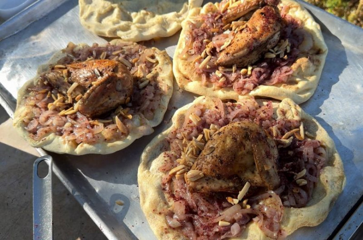 Musakhan ist ein Klassiker der palästinensisch-jordanischen Küche: Hähnchenfleisch, Gewürze und reichlich Zwiebeln werden auf einem fluffigen Fladenbrot serviert.