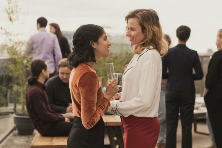Josephine Brenner (Karin Hanczewski, r.) veranstaltet eine Firmenfeier auf ihrer Dachterrasse. Hanna (Banafshe Hourmazdi, l.) ist beeindruckt von der Verlagschefin.