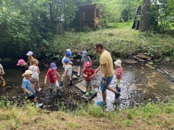 Damit der Dorfbach nicht weiter austrocknet, hat der Kindergarten in Holzheim im Landkreis Neu-Ulm die "Bachpatenschaft" übernommen: Sie bauen eine Hecke aus Altholz für Tiere im Uferbereich. Weidenstecklinge direkt an der Uferböschung sollen bald Schatten spenden, den Bach kurvenreicher machen und ihm wieder zu mehr Leben verhelfen. Unterstützung bekommt die Gruppe vom Bauhof der Gemeinde und vom Landratsamt, dessen Umweltexperten den Kindern die Zusammenhänge rund um den Bach näherbringen.
