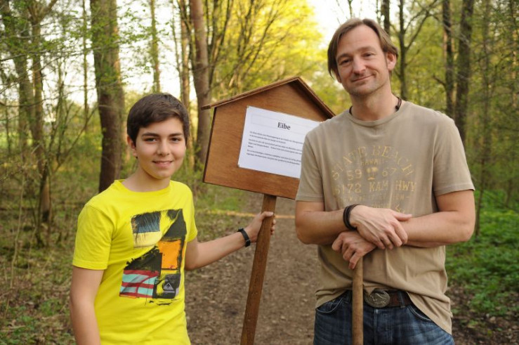 Felix und Gregor präsentieren stolz das neue Schild. Von links: Felix Kramer (Shayan Hartmann) und Gregor Brunner (Holger M. Wilhelm).
