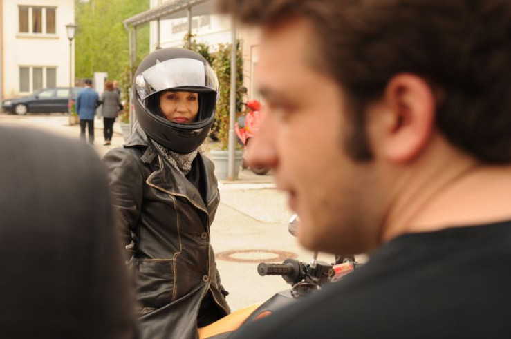 Flori fragt sich, wer die Dame auf dem Motorrad ist. Von links: Jana Keller (Isabella Hübner) und Florian Brunner (Tommy Schwimmer).