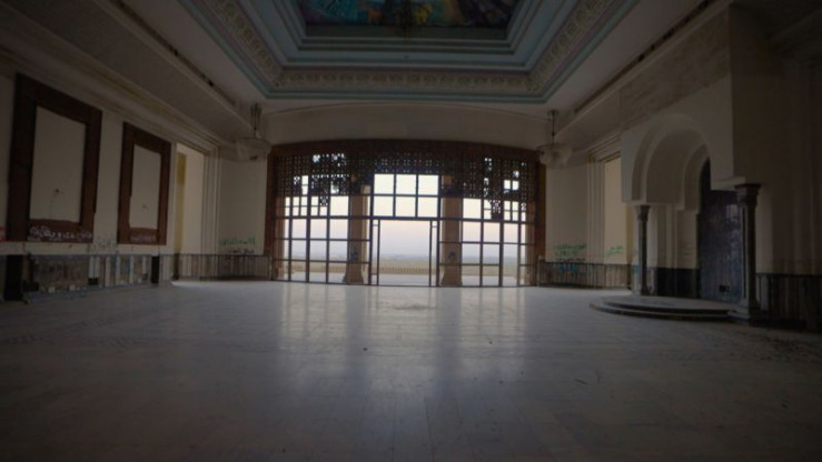 Bildunterschrift: Einst ein Symbol für Luxus, heute zieren Graffitis den geplünderten Palast Saddam Husseins in Babylon, der zeitweise als US-Militärlager fungierte.