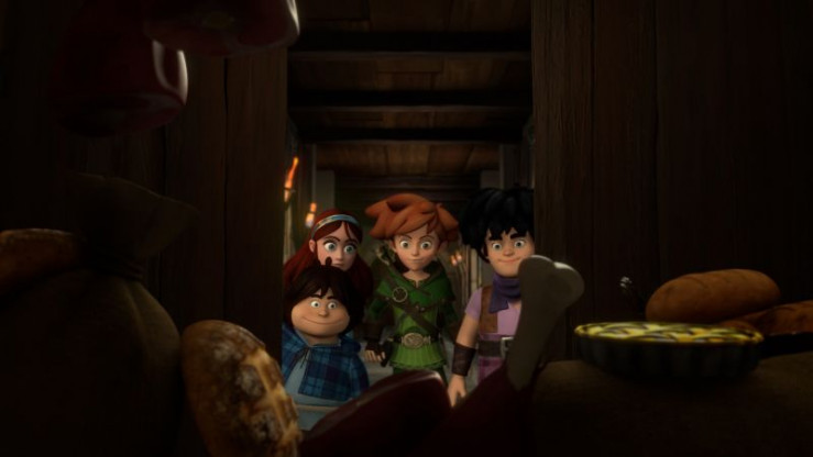 Tuck, Robin Hood, Little John und Scarlett haben die gefüllte Speisekammer des Prinzen gefunden.