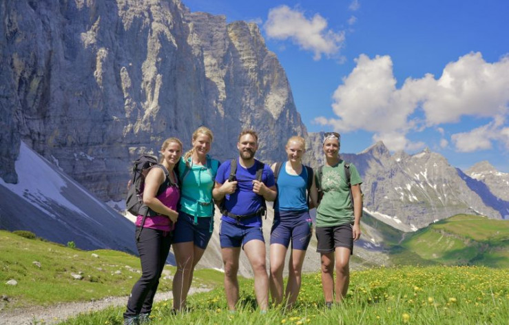 Bertl und Claudia Rackwitz-Hartmann (Mitte und 2. von links) sind die neuen Hüttenwirte der Lamsenjochhütte im Karwendel. Die beiden haben erst im Jahr zuvor die frisch renovierte Falkenhütte als Pächter übernommen. Im Winter betreiben sie auch noch eine Après-Ski-Hütte in Fieberbrunn. Eine Herausforderung für die ganze Familie.