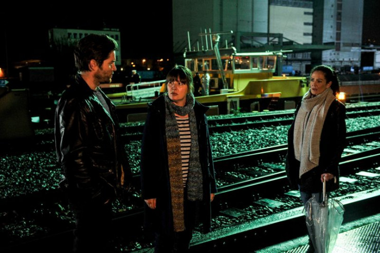 Die Kommissare Jo Stoll (Peter Ketnath, l.) und Selma Kirsch (Yve Burbach, r.) informieren die Bootsfrau Lisa Porst (Nina Vorbrodt, M.), dass der Kapitän Horst Weber tot im Frachtraum seines Schiffes gefunden wurde.