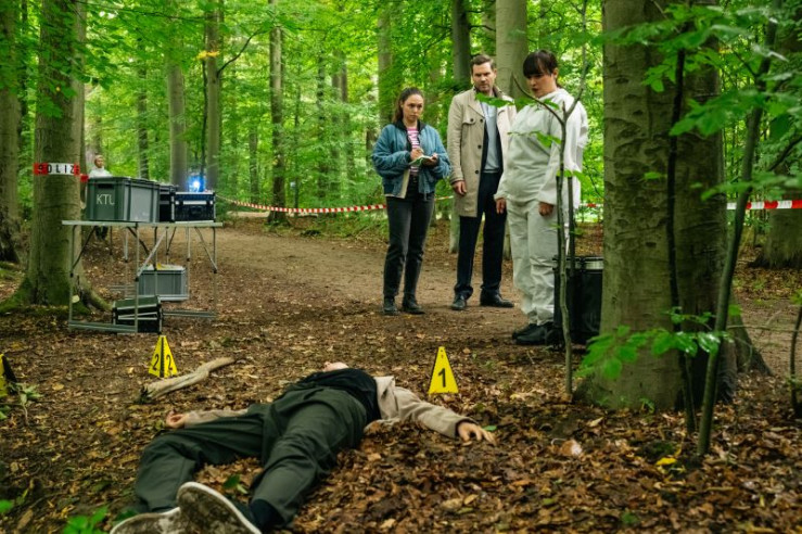 Während des Probenwochenendes einer Schützenkapelle wird die Dirigentin Nadja Schilling (Kaja Schmidt-Tychsen, l.) erschlagen im Wald aufgefunden. Dr. Westphal (Yulia Yáñez Schmidt, r.) erklärt den Kommissaren Jonas Fischer (Lukas Piloty, 2.v.r.) und Amira Mahdi (Aylin Ravanyar, 2.v.l.), dass der Tubist die Leiche gefunden hat.