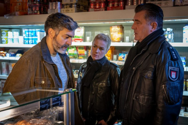 Franzi (Rhea Harder-Vennewald, M.) und Hans (Bruno F. Apitz, r.) befragen Demir Kaplan (Neil Malik Abdullah, l.) zu dem Überfall auf seinen Laden, doch Kaplan ist mit den Gedanken bei seiner Tochter, die angeschossen wurde.