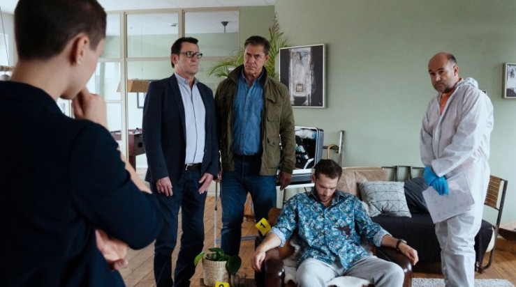 Finn (Sven Martinek, 3.v.l.) und Lars (Ingo Maujoks, 2.v.l.) sehen sich gemeinsam mit Nina (Julia E. Lenska, l.) am Tatort um. Strahl (Christoph Tomanek, r.) inspiziert die Leiche (Vinzenz Wagner, 2.v.r.).