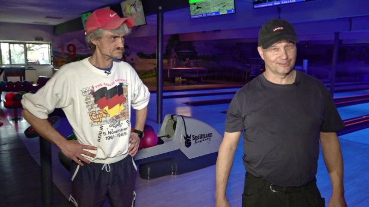 Im Duell der Kindheitsfreunde Michael (re.) und Dieter steht es unentschieden. Beim Bowling soll nun der Sieger ermittelt werden.