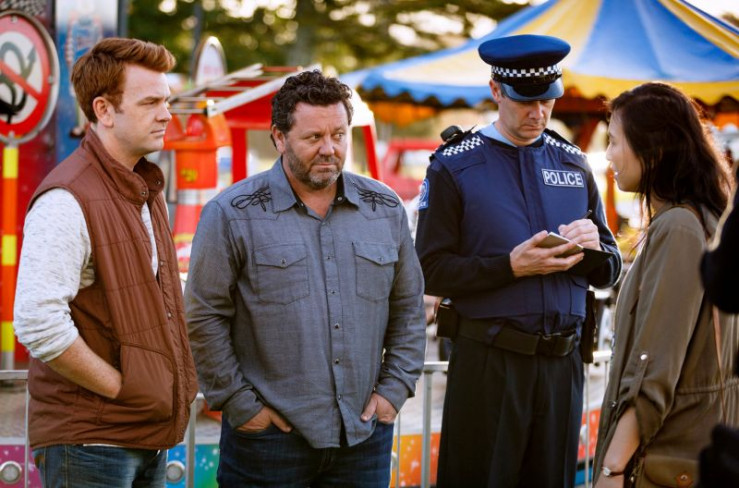 Tot im Gruselkabinett: Mike Shepherd (Neill Rea, 2. v. li.) und D. C. Breen (Nic Sampson, li.) ermitteln auf dem Jahrmarkt und erhalten von Jackie Lee (Katlyn Wong, re.) einige Informationen.