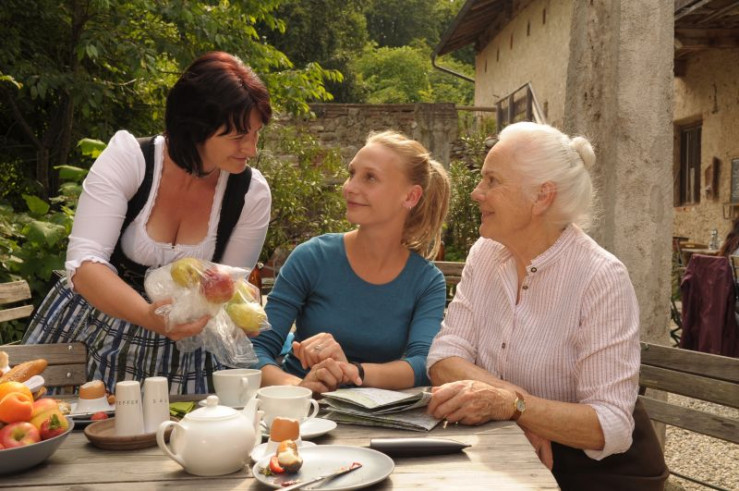 Theres und Klara freuen sich über die Brozeitpackerl von der Wirtin. Von links: Wirtin (Irmi Mayerhofer), Klara (Josephine Kroetz) und Theresa Brunner (Ursula Erber).