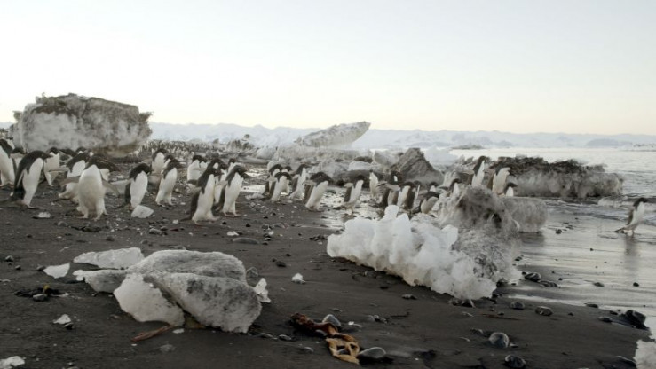 Adeliepinguine am Kap Adare. Sie gehen in großen Gruppen auf Nahrungssuche.