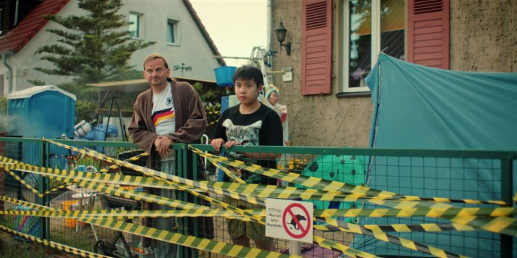 Die Knuppes (Milan Peschel, l., Hoang Minh Ha, M. und Minh-Khai Phan-Thi, r.) fliehen vor der Insektenplage im Haus in ihren Garten.