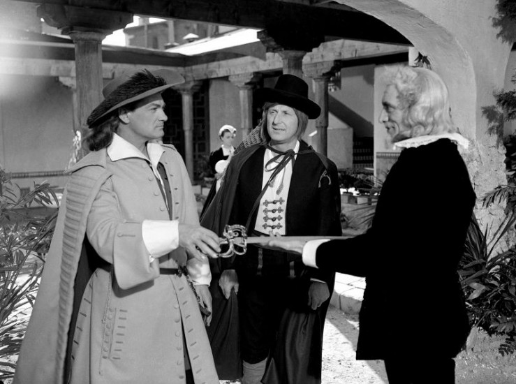 Henri de Lagardère (Jean Marais, l.) und sein Freund Passepoil (Bourvil, M.) finden Unterschlupf bei Don Miguel (Paul Cambo) in Toledo.