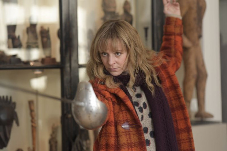 Angelika Flierl (Bernadette Heerwagen) eilt ihrem Kollegen Schaller mit einem Degen zur Hilfe und überwältigt einen gesuchten Verdächtigen.