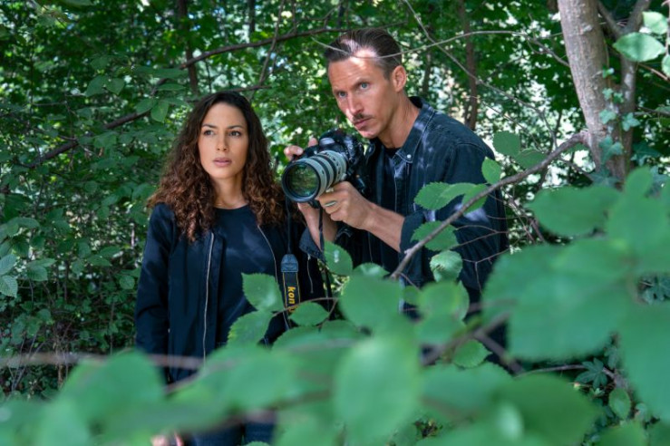 Kim Nowak (Amy Mußul) und Moritz Brenner (Johannes Hendrik Langer) stehen mit einer Kamera im Gebüsch, um einen Verdächtigen zu observieren.