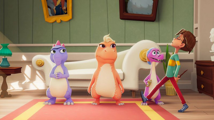 Die drei Dinos Doris, Trina und Socke stehen im Wohnzimmer und hören gespannt auf Leo, der ihnen einige Dinge erklärt.