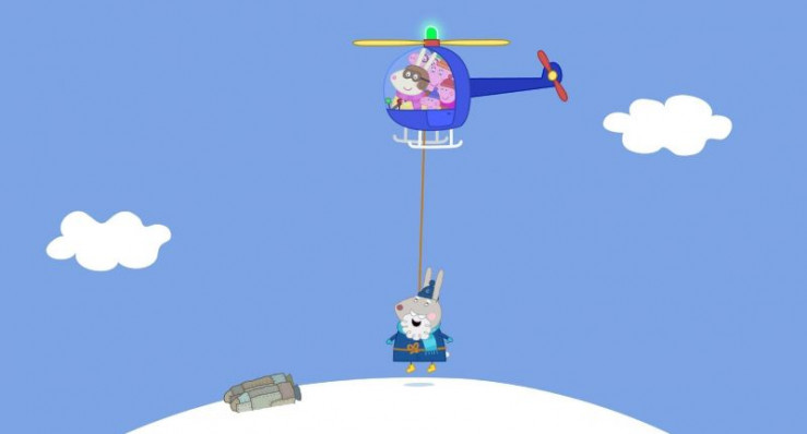 Frau Mümmel und Familie Wutz (o.) retten Opi Mümmel (u.) mit einem Hubschrauber von einem schneebedeckten Berg. Nachdem er mit seinem Raketenrucksack hoch hinaus schießt steckt er dort fest. +++ Die Verwendung des sendungsbezogenen Materials ist nur mit dem Hinweis und Verlinkung auf RTL+ gestattet. +++