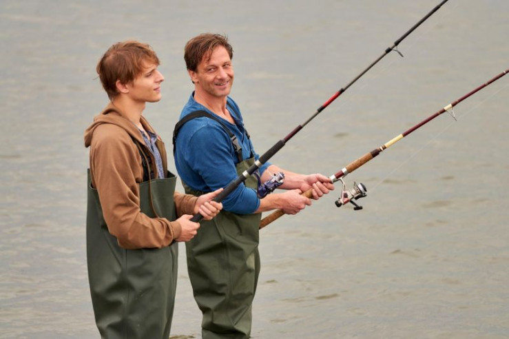 Stefan (Hendrik Duryn, r.) und sein Sohn Jonas (Merlin Rose) entspannen beim Angeln. +++ Die Verwendung des sendungsbezogenen Materials ist nur mit dem Hinweis und Verlinkung auf RTL+ gestattet. +++