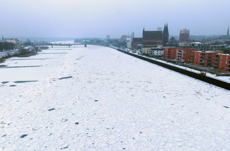 Die zugefrorene Oder bei Frankfurt. Kreisrundes Treibeis, sogenannte "Brieger Gänse", machen den Schiffsverkehr unmöglich.