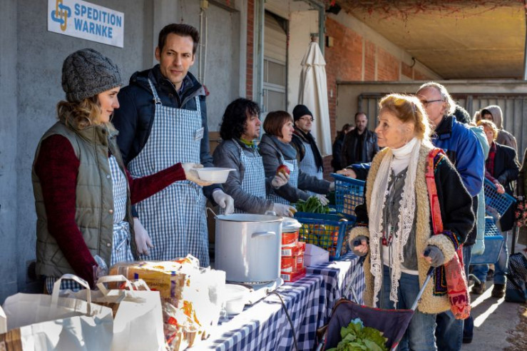 Josef Brandstetter (Alexander Mazza, 2. von l.) ignoriert Renate Burger (Ingrid Fröhlich, r.) bei der Essensausgabe.