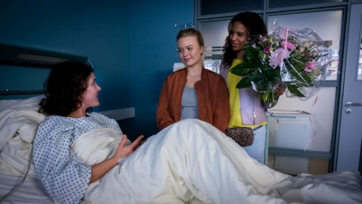 Pauline (Anna-Isabel Hinz, M.) und ihre Freundin Tamina (Souhaila Amade, r.) besuchen ihre Schulleiterin (Yasmina Djaballah, l.) und hoffen, dass sie bis zum Abiball wieder genesen ist.