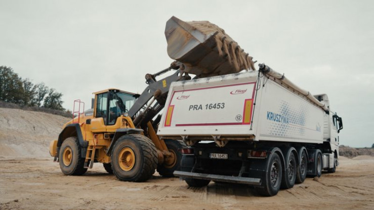 Ein Radlader verlädt Sand auf einen Sattelzug - der Beginn einer Transportkette, in der Straße, Schiene und Seeweg nahtlos ineinandergreifen.