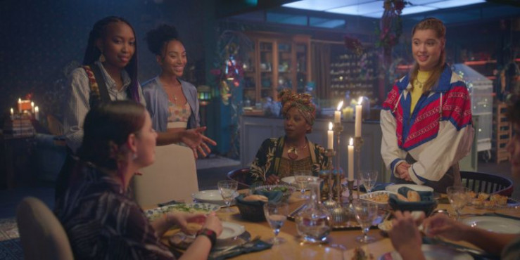 Ceces Tante Ginger (Raven Dauda, 2.v.r.) hat Cece (Hailey Romain, 3.v.l.) und Jade (Georgia Pemberton, r.) zum Abendessen zu sich eingeladen. Dort lernt Jade, die neu an der Ballettschule ist, auch Amy (Imogen Mackie Walter, l.) und Lola (Gomolemo Kitso Tsagae, 2.v.l.) kennen. Niemand ahnt, dass Jade eine Mystic ist, die sich hier in den Kreis der Wizen eingeschlichen hat.