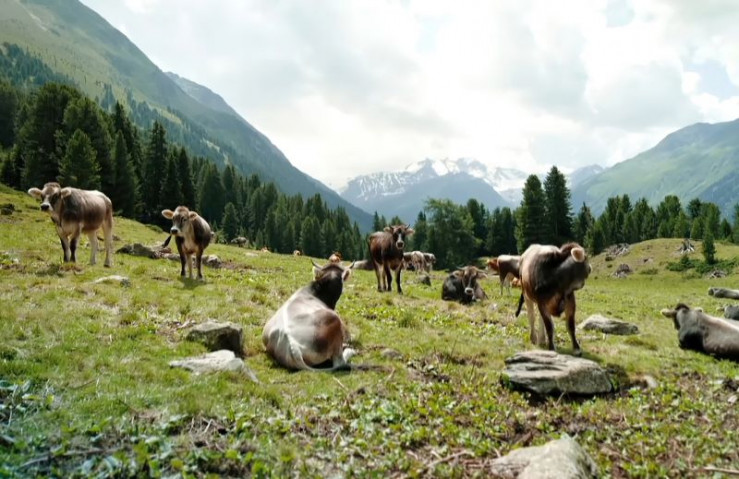 Der Klimawandel trifft die Almen hart - Kühe genießen hier die Sonne.