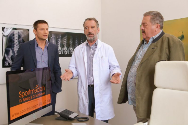 Die Kommissare Korbinian Hofer (Joseph Hannesschläger, r.) und Sven Hansen (Igor Jeftic, l.) verdächtigen Dr. Behring (Heio von Stetten, M.).