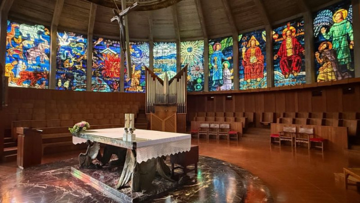 Zu Gast ist der Gottesdienst dieses Mal in der Porciuncula, dem Gotteshaus des ansässigen Franziskanerordens. Unter Touristen ist die Kirche als Glaskirche bekannt, weil die Wände aus prachtvoll gestalteten Glasfenstern bestehen.