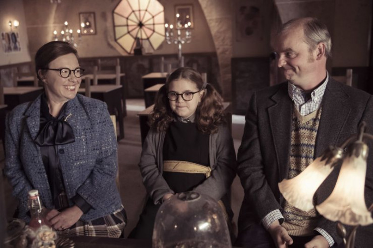 Es ist Elternabend an der Graustein-Akademie und Maude (Meibh Campbell, M.) ist gespannt, ob ihr Vergessenszauber gewirkt hat. Ob alle Lehrer ihre Missetaten vergessen haben, so dass ihre Eltern (Lynsey-Anne Moffat, l. und Henry Miller, r.) stolz auf sie sein können.